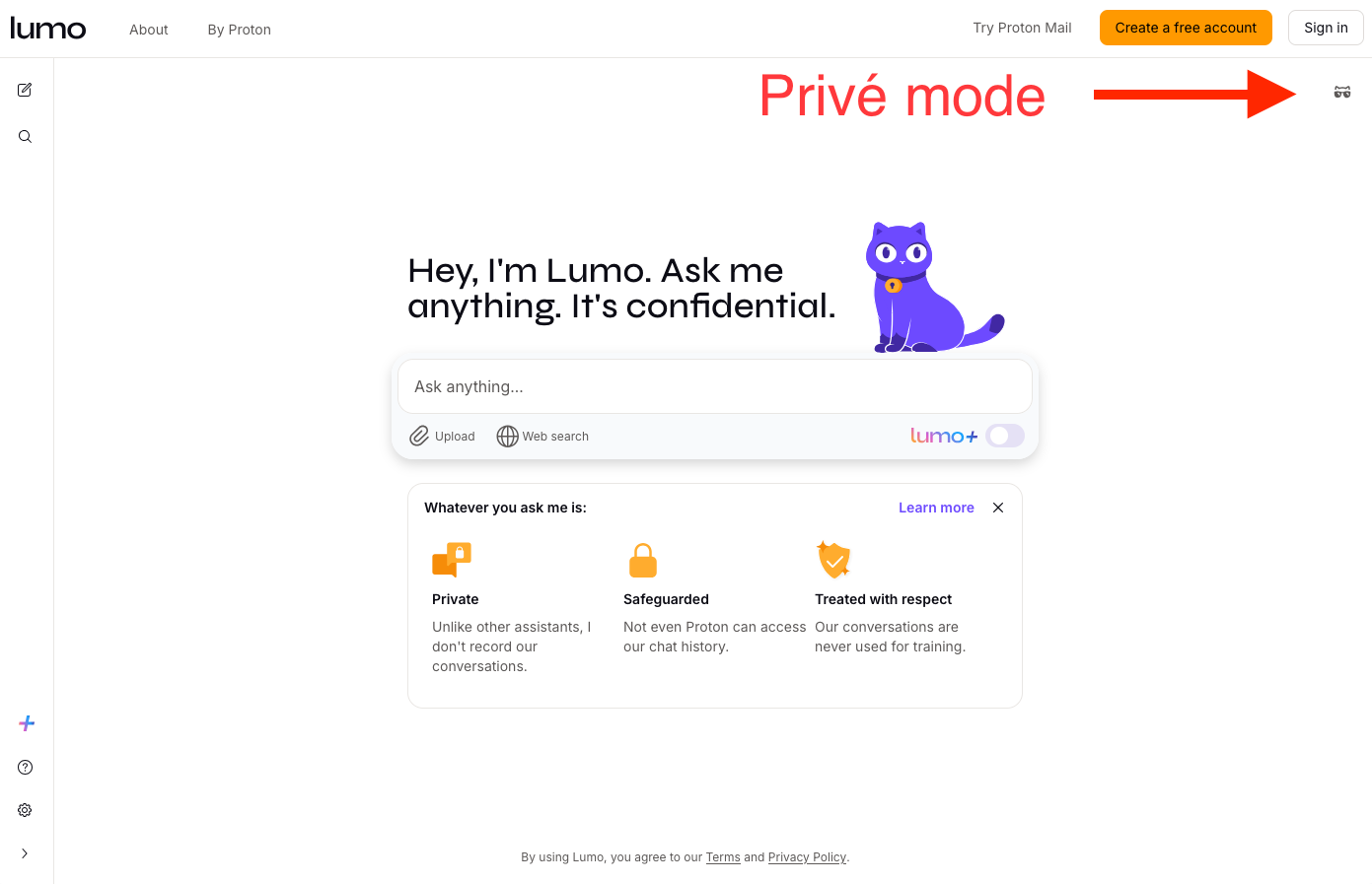 Maak kennis met de mascotte van Lumo: een nieuwsgierige, intelligente en attente paarse kat. De symboliek achter deze keuze is diepgaand. We vertrouwen onze huisdieren. We weten dat ze discreet zijn en onze geheimen bewaren. Lumo belichaamt deze loyaliteit en onafhankelijkheid. De kat is aanwezig om te helpen, maar dringt zich nooit op in je persoonlijke ruimte, en respecteert altijd je grenzen. De kenmerkende paarse kleur verbindt Lumo direct met het vertrouwde merk van Proton, een naam die voor meer dan 100 miljoen mensen synoniem is met online privacy.
